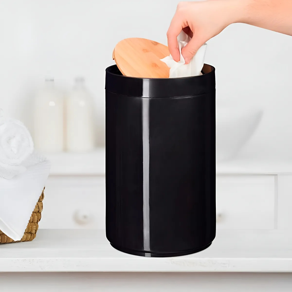 Cesto de basura con pedal y un diseño elegante que combina metal con una tapa de bambú. Su capacidad de 6 litros es ideal para el baño o la cocina, e incluye un balde interior removible para facilitar la limpieza.